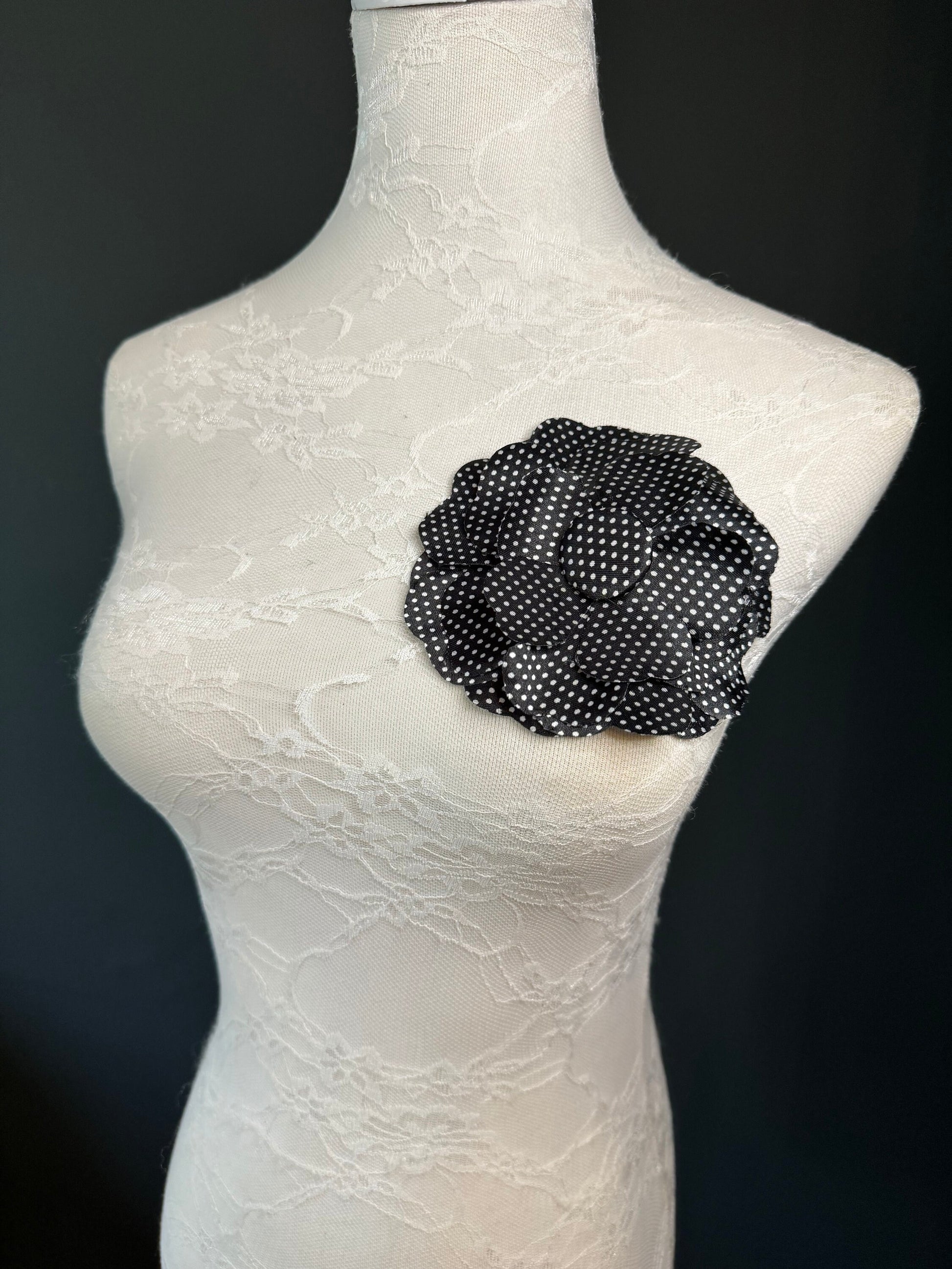 Corsage Flower, Pin on, Black White Spot, 5” Wide, Satin Fabric Pin on Corsage, Bridal, Clothing, Accessory, Fashion, Gift, FAN Design