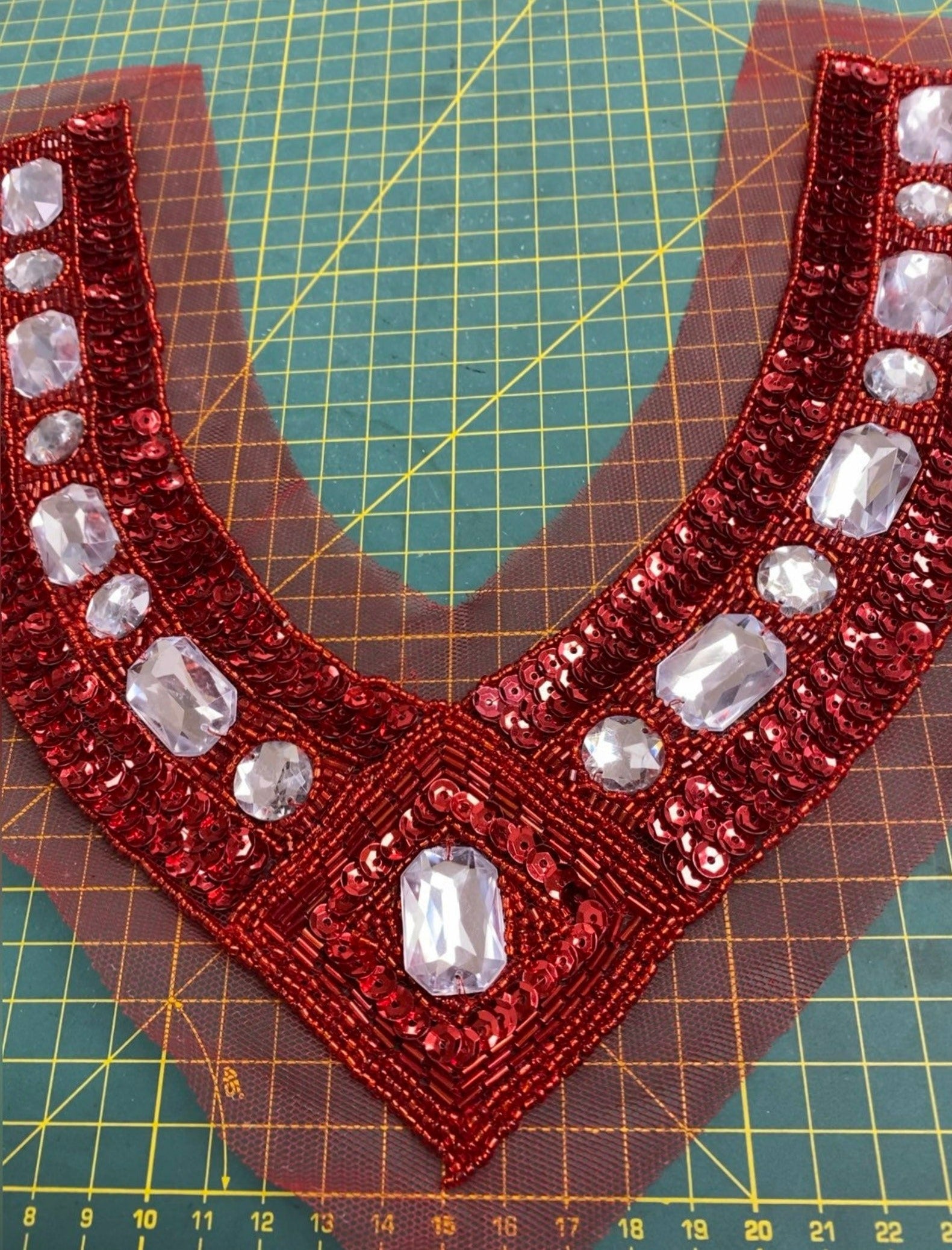 Beaded neck trim with sequins, tubes & jewels.