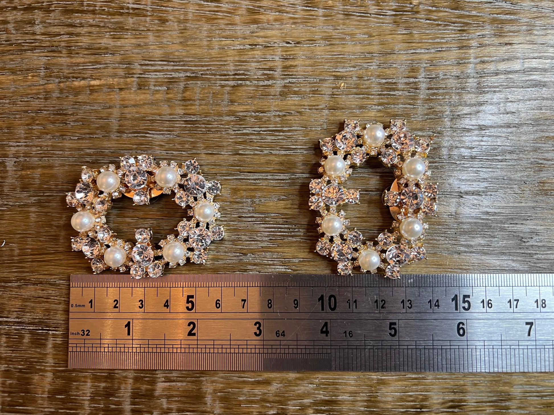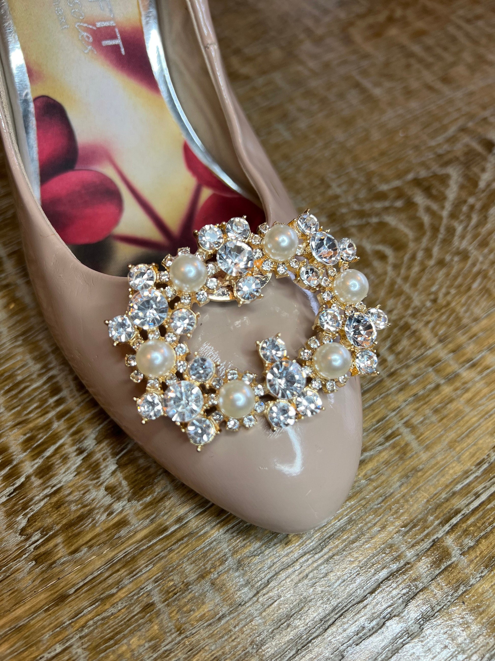 Stunning clip on Rhinestone and Pearl with Silver or Gold BaseAdd sparkle and shine to a plain shoe or bag with this easy clip on piecePrice per piece, so if needed for shoes, please order two pieces.Size approx: 6cm x 4.5cm 2.5inch x 1.5inchOther designs available